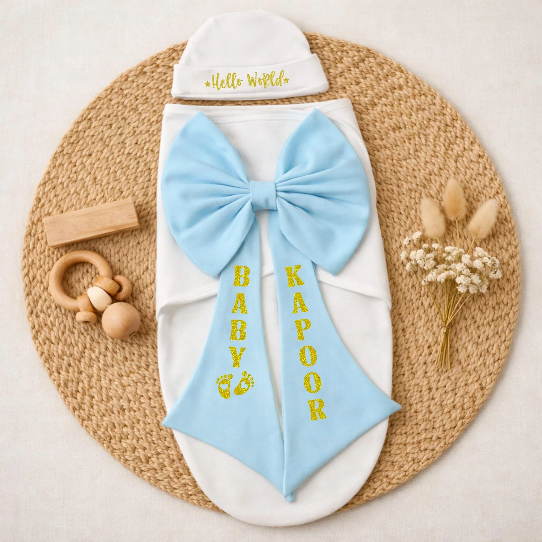 This baby bow wrap also offers personalization, allowing you to add your baby’s name for a unique and meaningful touch. It turns a simple essential into a cherished keepsake that celebrates your baby’s arrival in the most special way.