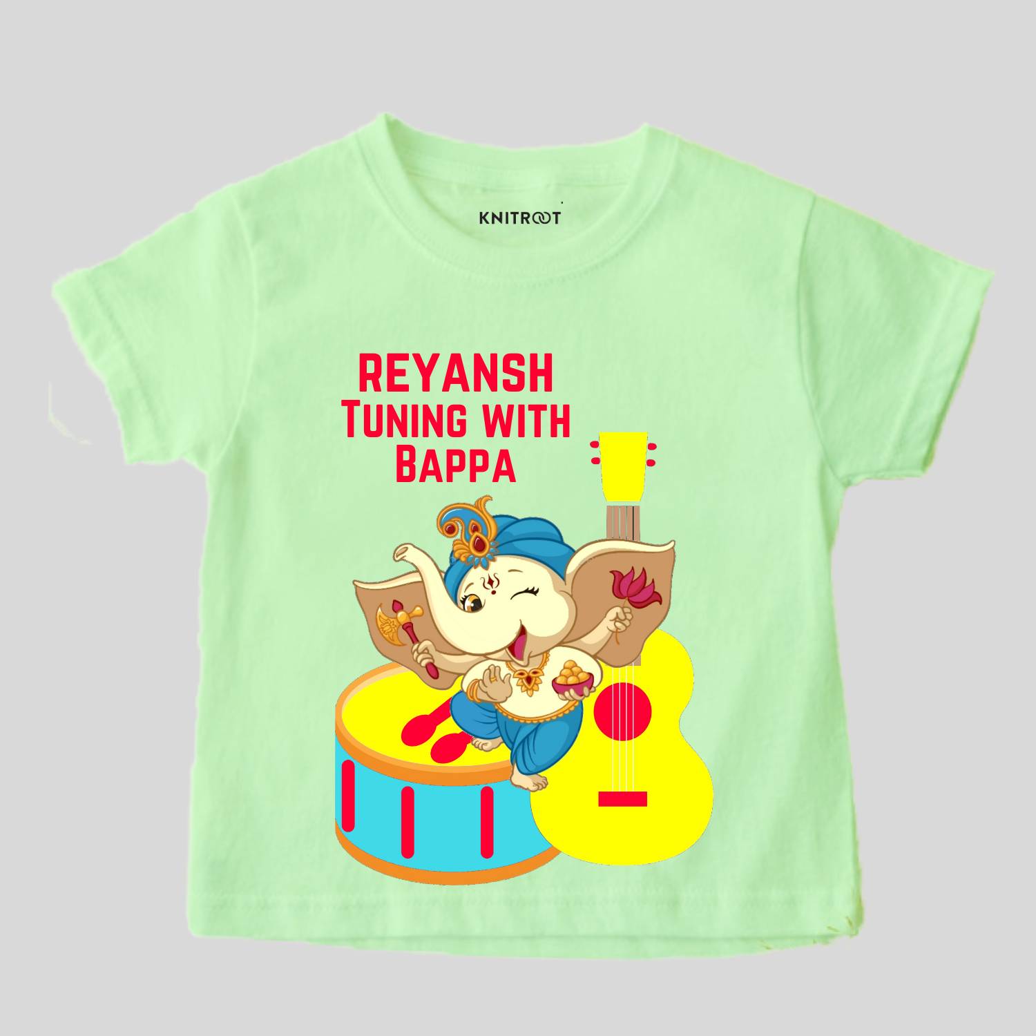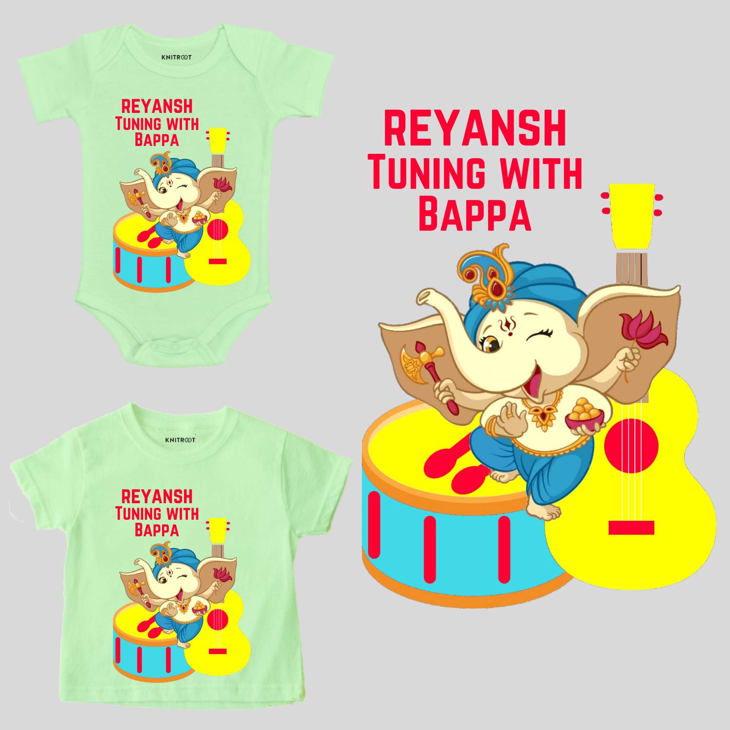 Ganpati Bappa Morya! Ganesh Chaturthi is a popular festival that celebrates the birth of Lord Ganesha! We try our best to oomph up your child’s special occasions, which is why we are excited in bringing to you the lovely Ganesh t shirt & onesie collection comprising of ganpati printed t shirt, onesies, and rompers. Make sure your little one is impressing Bappa and is grandly welcoming the Lal Baug Cha Raja by dressing up in this special collection. Also, don’t forget to capture these moments! Not only is our range of designs and captions unique and stylish but also, the collection is consisting of colours ranging from soft to vibrant. Moreover, each design is available from size New Born up to 5XL for adults in multiple colours and prints. The onesies/t-shirts are digitally printed. Bappa especially loves the kids who wear Knitroot Ganesh T-shirts! All the Bappa Fans, don’t miss this chance, wear a Knitroot Ganesh t-shirt and dance!